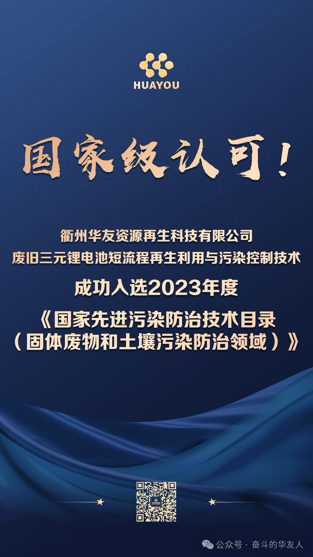 Recently, the technology independently developed by Quzhou Huayou Resource Recycling Technology Co., Ltd. — the short process for recycling and pollution control of waste ternary lithium batteries — was successfully selected for the "once every three years" 2023 National Catalogue of Advanced Pollution Control Technologies (for Solid Waste and Soil Pollution Control) (hereafter referred to as the "Catalogue"). In the field of ternary lithium battery recycling, only two companies nationwide were selected for this national-level demonstration technology in the solid waste pollution control domain.